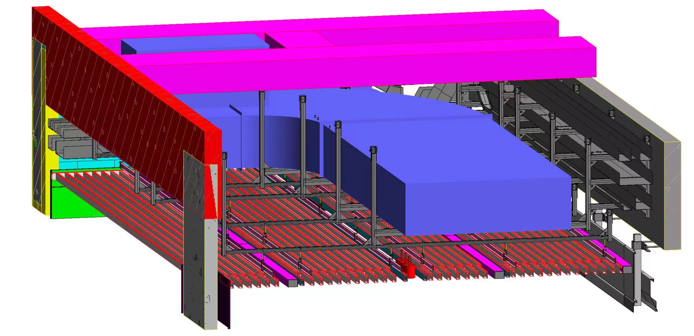 本工程分三個標段,合計總建筑面積為56.1萬㎡,建筑最高高度34.8m,其中一、三標段為多層大跨度鋼結構廠房。眾所周知,對于鋼結構廠房支架設計一直是行業內的難題。華固充分利用BIM技術,自主研發的成品